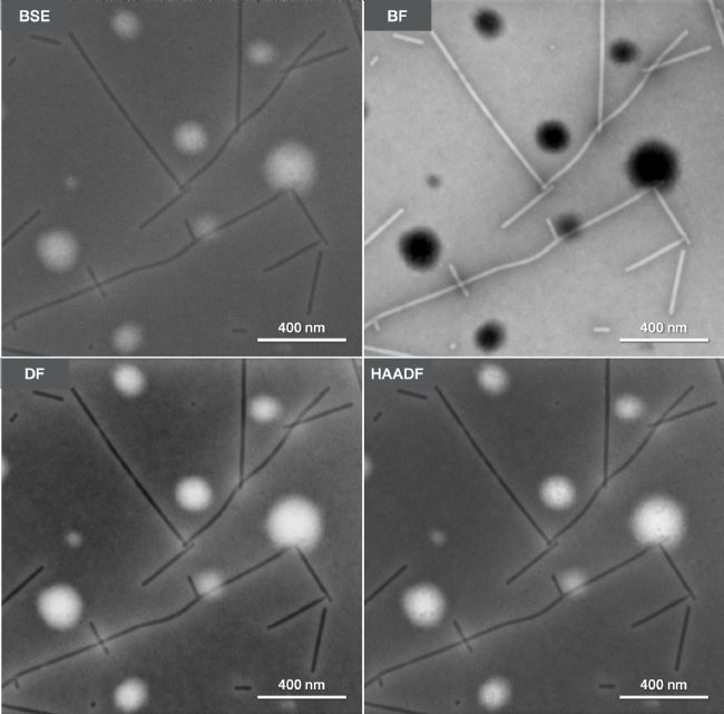 煙草花葉病毒的 BSE 像、BF 像、 DF 像和 HAADF 像