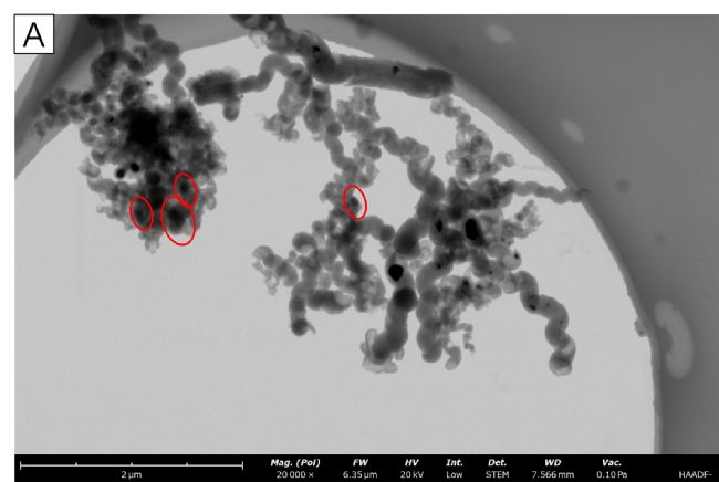 在掃描電鏡的 SED 圖中可以直觀顯示碳納米管的粗細(xì),以及碳納米管之間的交織狀態(tài)。但是在 STEM 圖中,可以看到隱藏在 3D 結(jié)構(gòu)中的小顆粒,這些顆粒在 SEM 圖中是無法看到的。