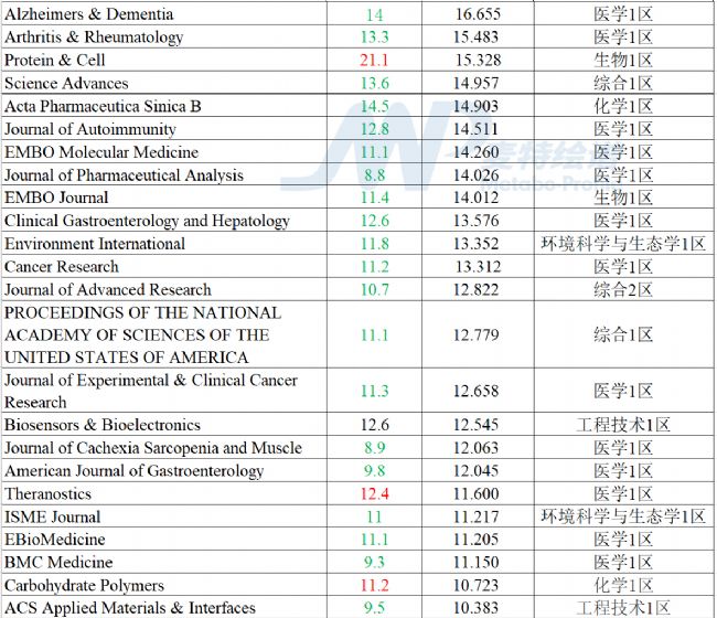 Blood降到20.3,Hepatology降到13.5,Immunity大幅降低到32.4,European Respiratory Journal大幅降低到24.3;腫瘤領(lǐng)域Cancer Cell大幅升高并突破50大關(guān),Journal of Hematology & Oncology升高到28.5,Theranostics升高到12.4。