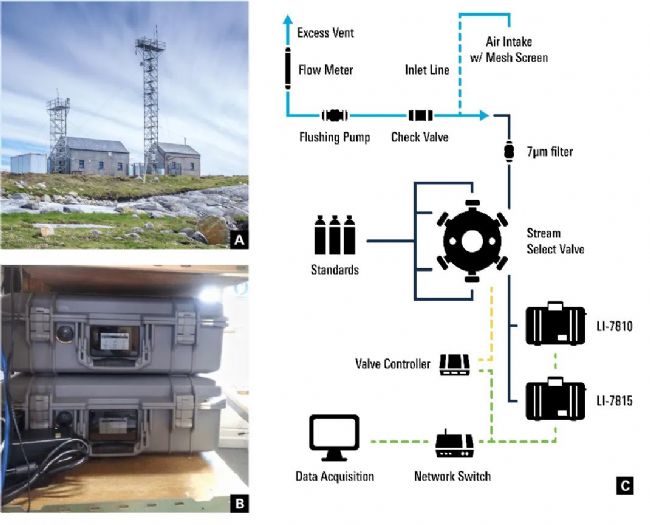 A 梅斯黑德大氣研究站;B LI-7810和LI-7815氣體分析儀;C是氣體樣品測量氣路和校準(zhǔn)裝置。A圖由Gavin Kelly拍攝,版權(quán)所有 Colin O'Dowd,LI-COR有轉(zhuǎn)載授權(quán)(2020)