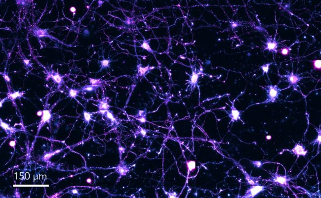Neuronal synaptic markers Bassoon (magenta) and Homer-1 (cyan) labeled with anti-mouse AZ647 and anti-rabbit CF583R (cyan) in primary rat cortical neurons.