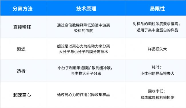在外泌體、病毒等生物樣本的生化指標分析中,熒光抗體、熒光染料的標記往往是必不可少的實驗操作手段。然而,標記后游離染料的殘留卻常常成為樣本分析的“隱形殺手”。它們往往會引入高的熒光背景、淹沒樣本的真實信號,導(dǎo)致我們的研究偏離真實結(jié)果。因此,去除這些游離染料至關(guān)重要。常用的去除游離染料的方法有:直接稀釋、透析、超濾、超速離心等,但這些方法往往需要昂貴的設(shè)備,并且存在操作繁瑣、樣本回收率低、游離染料殘留等限制(表1)。