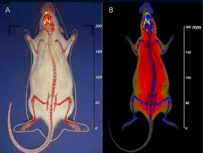 大鼠活體成像,骨密度增強(qiáng)彩色融合顯示