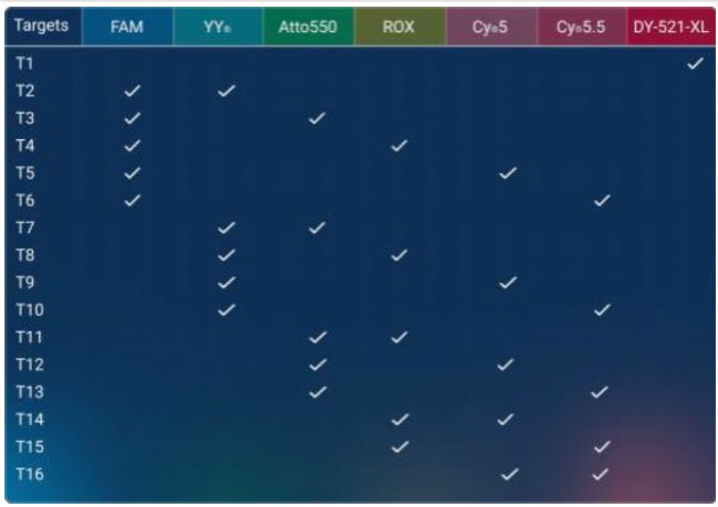 7色熒光通道,包含新型Long shift染料,配合創(chuàng)新雙標設計,突破通道限制,單孔檢測靶標數(shù)量增加4倍,節(jié)省樣品、時間和成本,獲得更多生物信息。
