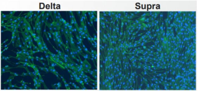 在 Nunclon™ Supra 表面上測(cè)試了人真皮成纖維細(xì)胞(Human Dermal Fibroblasts),結(jié)果進(jìn)一步證明Nunclon™ Supra 表面更好地支持原代細(xì)胞的增殖和生長(zhǎng)。