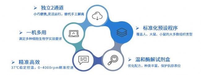 DSC-200由2個獨立通道構(gòu)成,可以將新鮮實體組織快速制備成高質(zhì)量的單細(xì)胞懸液或組織勻漿等。同時儀器搭配加熱套、組織處理管、溫和酶解試劑盒,實現(xiàn)全自動組織處理。2通道獨立運行,可在30min內(nèi)完成制備,獲得活性高、得率高、均一性好的單細(xì)胞懸液。