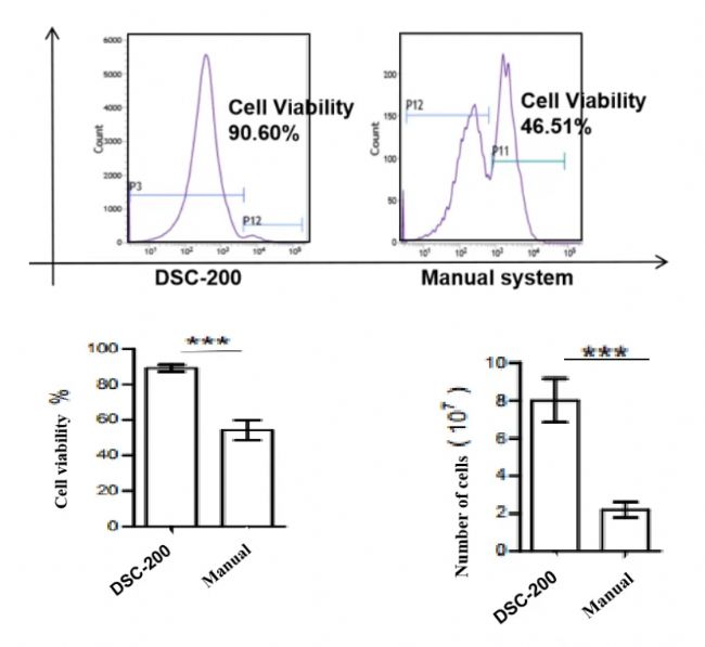 小鼠肺癌組織(LLC)分別使用DSC-200的2通道解離,流式細(xì)胞儀檢測DSC-200處理活率>90%,活率與得率穩(wěn)定高于手工解離結(jié)果。