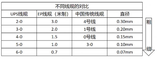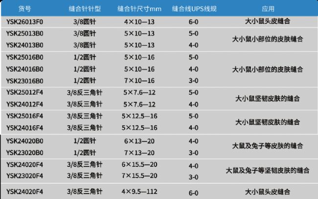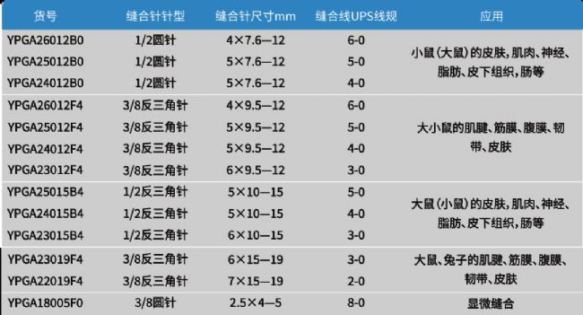 (2)線(xiàn)規(guī),目前主流的線(xiàn)規(guī)主要有UPS線(xiàn)規(guī)、EP線(xiàn)規(guī)和中國(guó)傳統(tǒng)線(xiàn)規(guī)三種描述方式,通常我們使用的是UPS線(xiàn)規(guī)。其中,大小鼠等小動(dòng)物手術(shù)常用的縫合線(xiàn)規(guī)格為:3-0,4-0,5-0,6-0,可應(yīng)用于動(dòng)物的皮膚、筋膜、肌肉、深部組織的縫合或血管結(jié)扎等。