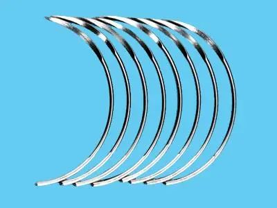(2)針的弧度,常見(jiàn)的有1/2弧針、3/8弧針、1/4弧針、5/8弧針等。其中,3/8弧針是主要應(yīng)用于皮膚、筋膜、肌肉、組織等縫合的,1/2適合更深部組織的縫合,適當(dāng)?shù)膹澔】梢杂欣诳p合傷口,創(chuàng)口較深的可以選擇弧度更大的針操作更加簡(jiǎn)便。