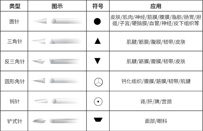 其中圓針和反三角針使用更為廣泛,圓針由于其鋒利的尖端和光滑的針體在皮膚、筋膜或組織等應(yīng)用較多;反三角針由于其外側(cè)有尖銳的脊鋒且開(kāi)鋒在外側(cè),適用于較為堅(jiān)韌的皮膚或筋膜組織,較三角針會(huì)產(chǎn)生更小的組織切割有利于組織愈合。