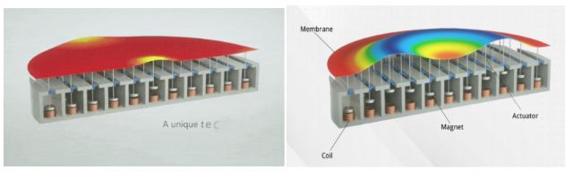 其中紅色表示薄膜、黃色表示線圈、灰色表示磁鐵、藍(lán)色表示彈簧(聚合物制成),通過給線圈加電流促使磁鐵上下運(yùn)動(dòng)而使薄膜產(chǎn)生形變。