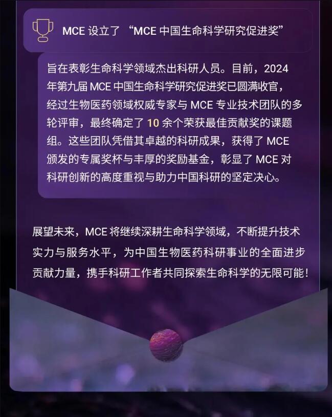 自 2016 年以來(lái), “MCE 促進(jìn)獎(jiǎng)” 評(píng)選活動(dòng)已連續(xù)開(kāi)展八年之久,MCE 有幸與科研工作者們共同見(jiàn)證了中國(guó)生命科學(xué)領(lǐng)域的蓬勃發(fā)展。“MCE 生命科學(xué)研究促進(jìn)獎(jiǎng)” 旨在表彰科研人員對(duì)生命科學(xué)領(lǐng)域作出的杰出貢獻(xiàn)。此外,MCE 希望能支持更多科研團(tuán)隊(duì)或個(gè)人的科學(xué)探索工作,助力各位攀登科學(xué)之高峰!