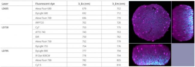 多波段近紅外激光器可選,支持新型的近紅外染料,近紅外的深層穿透和低組織吸收,進一步加深細(xì)胞球、類器官等厚樣品的3D成像