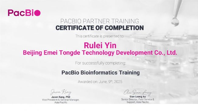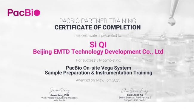 目前,怡美通德已經(jīng)通過PacBio Vega系統(tǒng)樣本制備與儀器使用培訓(xùn)和生物信息學(xué)培訓(xùn)的官方認(rèn)證