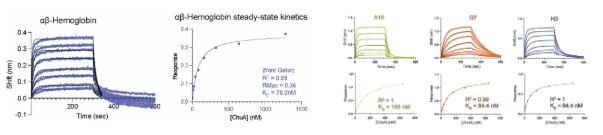 Gator® 分子互作檢測(cè)流程:NI-NTA 傳感器固化 his- binder, αβHb dimer 或者 myoglobin 結(jié)合不同濃度的 ChuA 蛋白,得到親和力常數(shù)。