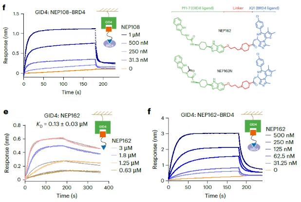 該研究中利用 Gator® BLI 完成大量親和力實(shí)驗(yàn),包括 GID4 與 NEP108-BRD4 三元復(fù)合物檢測(cè),以及 GID4 與 NEP162 二元復(fù)合物檢測(cè)。