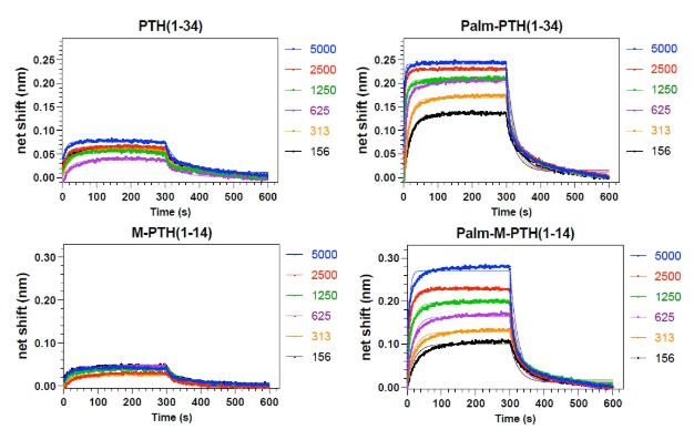Gator® BLI 檢測(cè)流程:SA 傳感器固化 Biotin-BSA,結(jié)合不同濃度的 PTH(1-34)、 Palm-PTH (1-34)、M-PTH(1-14)、Palm-M-PTH (1-14),得到親和力常數(shù)。