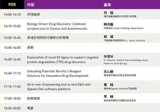 此外,來自瑞孚迪的技術(shù)專家王心媛和黃皓博士會(huì)分別就創(chuàng)新藥領(lǐng)域的試劑產(chǎn)品(HTRF,Alpha等)應(yīng)用方案和Signals軟件平臺(tái)帶來主題報(bào)告。