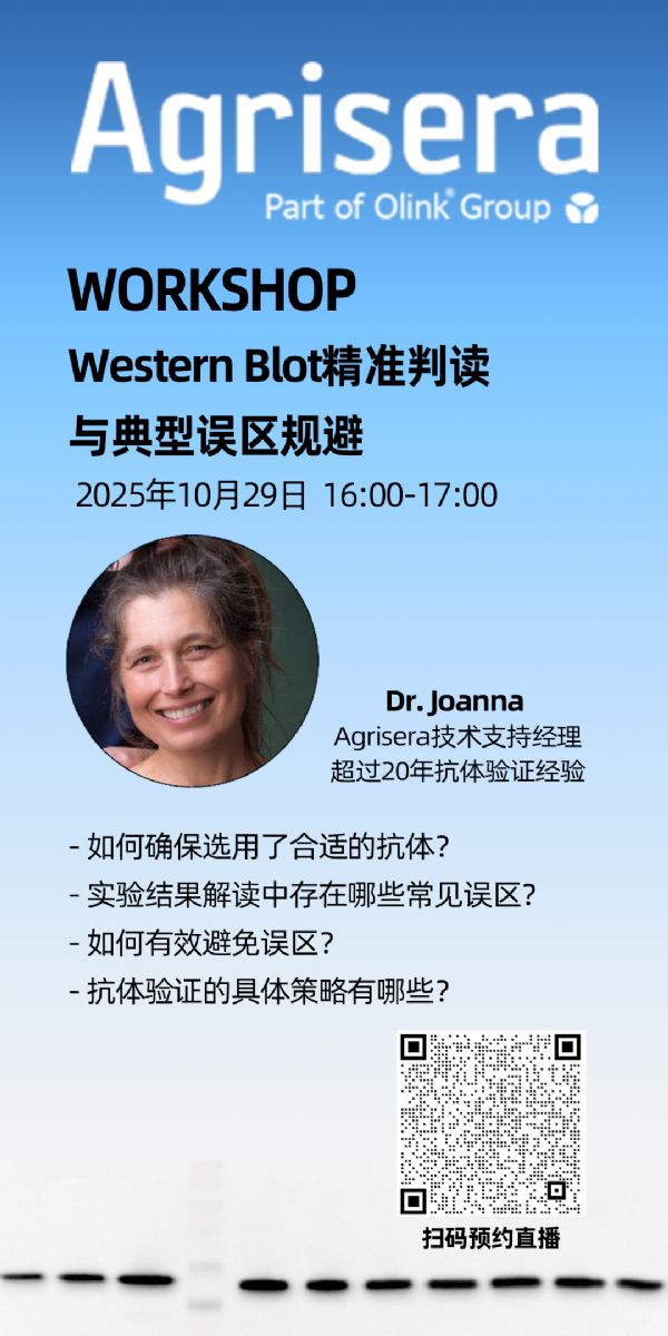 為助力科研人員攻克Western Blot實驗中的常見難題,西美杰攜手Agrisena公司技術專家Joanna博士,共同推出【W(wǎng)estern Blot全流程優(yōu)化】系列專題講座。10月29日(周三)下午4點,本系列第二講——“Western Blot結果精準判讀與典型誤區(qū)規(guī)避”即將在線開講。在本次課程中,Joanna博士將聚焦于Western Blot結果分析與常見誤區(qū),系統(tǒng)講解如何準確判讀條帶、并針對典型錯誤案例提供優(yōu)化方案,助您有效提升數(shù)據(jù)的可靠性與發(fā)表水準。