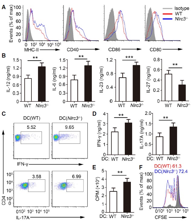 本研究首先構(gòu)建NLRC3-KO小鼠,然后從脾臟中分離樹突狀細胞,LPS刺激之后,發(fā)現(xiàn)樹突狀細胞中促進Th1細胞和Th17細胞分化的細胞因子表達增加,樹突狀細胞的抗原呈遞功能增強,其激活CD4+T細胞并將其分化為Th1和Th17亞群的能力也隨之增強(Fig.1)。