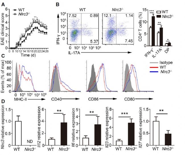 除了體外實驗,研究人員還使用MOG(35–55)誘導制備EAE模型(實驗性變態(tài)反應性腦脊髓炎動物模型,是一種以特異性致敏的CD4+T細胞介導為主的自身免疫性疾病,是人類多發(fā)性硬化癥的理想動物模型),發(fā)現(xiàn)NLRC3的缺失會增強CD4+T細胞分化以及加劇EAE發(fā)展,而其中樹突狀細胞中的NLRC3起到關鍵作用,從而通過體內(nèi)實驗驗證NLRC3負性調(diào)節(jié)樹突狀細胞的抗原呈遞功能(Fig.2)。