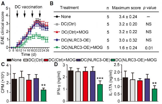 最后,研究人員還發(fā)現(xiàn)NLRC3的過表達會減弱樹突狀細胞的抗原呈遞作用,減輕EAE的發(fā)病程度(Fig.4),提示NLRC3可作為多發(fā)性硬化癥和其他自身免疫疾病治療的新靶點。
