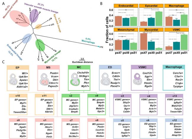 研究人員首先通過(guò)單細(xì)胞測(cè)序數(shù)據(jù)分析發(fā)現(xiàn)心臟流出道發(fā)育過(guò)程涉及6種類(lèi)型的細(xì)胞,并可進(jìn)一步細(xì)分為17個(gè)亞群(Fig.1)。