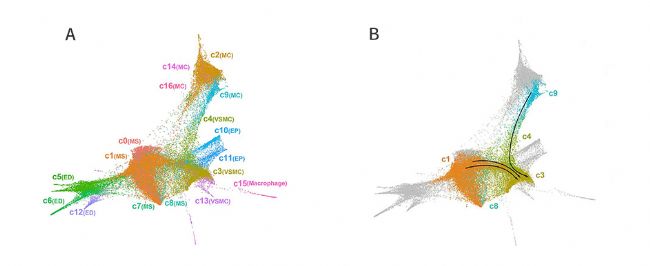 該研究系統(tǒng)分析了小鼠心臟流出道5萬(wàn)多個(gè)細(xì)胞(來(lái)自3個(gè)連續(xù)發(fā)育時(shí)期)的單細(xì)胞轉(zhuǎn)錄組,并結(jié)合單分子熒光原位雜交和譜系示蹤技術(shù),發(fā)現(xiàn)在心臟流出道發(fā)育過(guò)程中存在心肌細(xì)胞向血管平滑肌細(xì)胞轉(zhuǎn)換的情況,進(jìn)而首次提出了大動(dòng)脈基部平滑肌匯聚發(fā)育的概念。