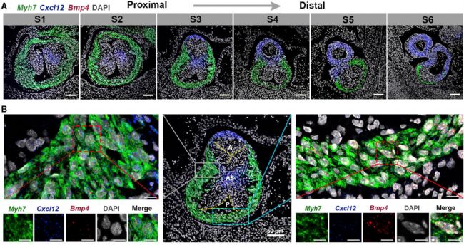通過(guò)單分子熒光原位雜交技術(shù)(Fig.3),研究人員對(duì)心臟流出道連續(xù)橫切面(從近端到遠(yuǎn)端)進(jìn)行觀察,發(fā)現(xiàn)了其從心肌細(xì)胞表型向平滑肌細(xì)胞逐漸過(guò)渡的現(xiàn)象,并且觀察到表達(dá)Myh7(心肌細(xì)胞標(biāo)志物)的細(xì)胞也同時(shí)表達(dá)Cxcl12(血管平滑肌標(biāo)志物),驗(yàn)證了在心臟流出道發(fā)育過(guò)程中心肌細(xì)胞向平滑肌細(xì)胞轉(zhuǎn)變的推論。