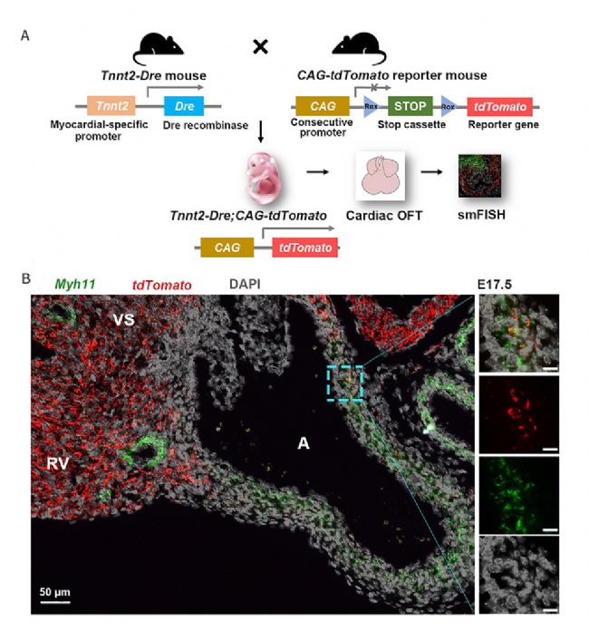 最后研究人員利用Dre-rox譜系示蹤技術(shù)(即構(gòu)建Tnnt2-Dre; CAG-RSR-tdTomato小鼠模型,F(xiàn)ig.4),特異性地標(biāo)記心肌細(xì)胞后代,通過(guò)觀察到tdTomato與Myh11基因(血管平滑肌標(biāo)志物)的共表達(dá)再次驗(yàn)證了流出道發(fā)育過(guò)程中心肌細(xì)胞向平滑肌細(xì)胞轉(zhuǎn)變的結(jié)論。