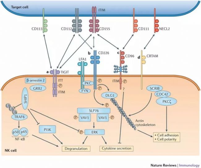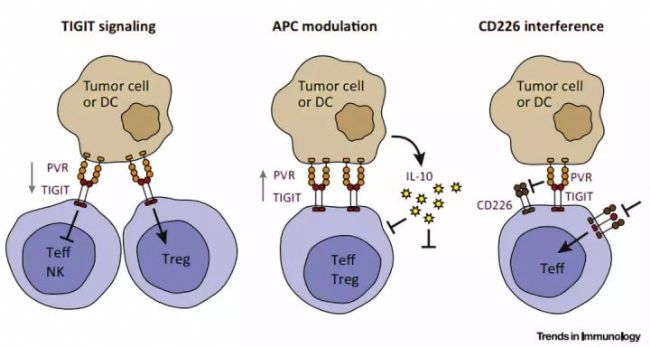 TIGIT可以在結(jié)合PVR后通過其細(xì)胞內(nèi)尾部的ITIM和/或ITT基序發(fā)出信號(下圖左)。