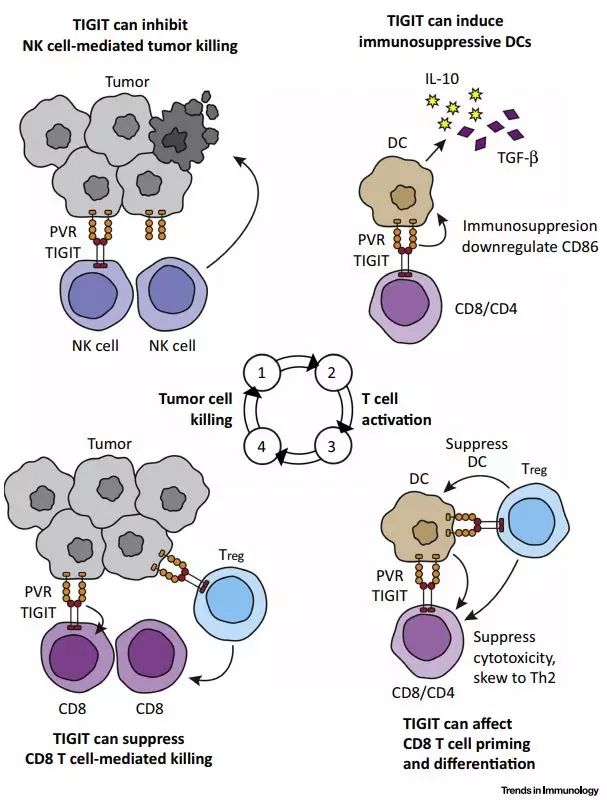 TIGIT可以在腫瘤免疫循環(huán)的多個步驟中抑制免疫細(xì)胞: