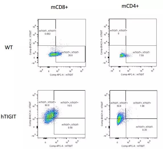 結(jié)果顯示:TIGIT人源化小鼠的輔助T細(xì)胞和毒性T細(xì)胞中均可以檢測到人源TIGIT的活躍表達(dá)。