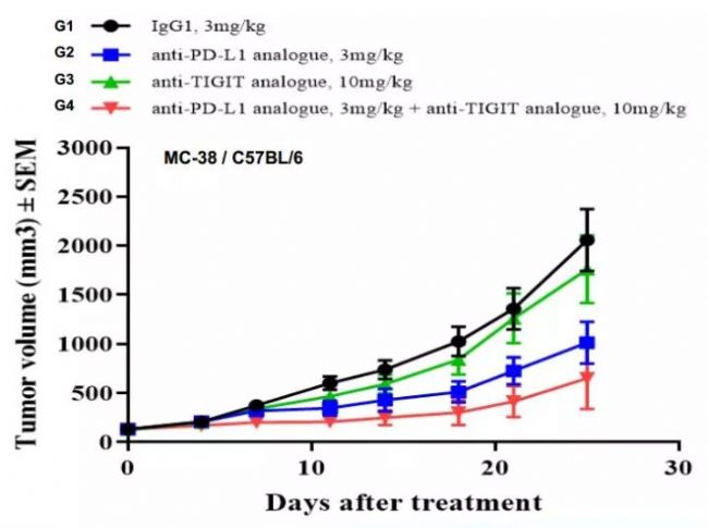 結(jié)果顯示:針對人的TIGIT抗體單獨(dú)給藥雖未見明顯抗腫瘤效果,但針對TIGIT抗體與PD-L1抗體聯(lián)合給藥表現(xiàn)出顯著的療效。