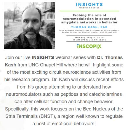 北卡羅來(lái)納大學(xué)教堂山分校鮑爾斯酒精研究中心的Thomas Kash博士舉辦的Inscopix Insight網(wǎng)絡(luò)研討會(huì)(北京時(shí)間5月5日2:00am)。Thomas Kash博士將討論他的團(tuán)隊(duì)使用Inscopix頭戴式顯微鏡(滔博生物中國(guó)區(qū)代理)最近的科研成果,以闡明肽和兒茶酚胺等神經(jīng)調(diào)節(jié)劑是如何改變細(xì)胞功能和改變行為的。他的網(wǎng)絡(luò)研討會(huì)將特別關(guān)注終紋床核(BNST),這是一個(gè)眾所周知的調(diào)節(jié)一系列情緒行為的區(qū)域。