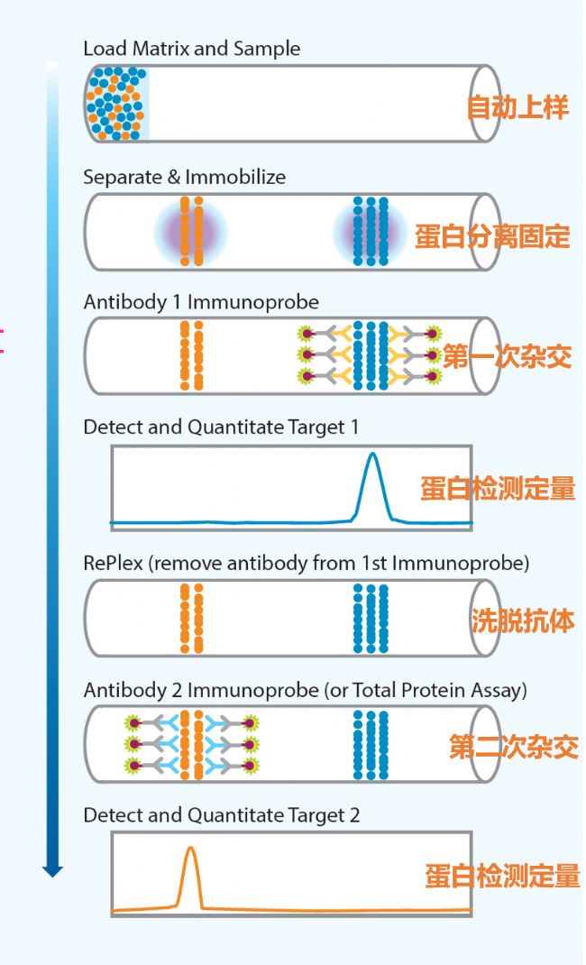 傳統(tǒng)Western Blot若從單個(gè)樣本中獲取更多的蛋白信息,即為了節(jié)省珍貴或昂貴的樣品,需要進(jìn)行strip-reprobe(洗脫-重雜交)。然而,眾所周知該技術(shù)會(huì)遭受不可預(yù)測(cè)的蛋白質(zhì)損失,并且通常需要冗長(zhǎng)的優(yōu)化以實(shí)現(xiàn)最佳的剝離效率并使蛋白質(zhì)在印跡上的保留最大化。這使得幾乎不可能使用標(biāo)準(zhǔn)的條帶和探針技術(shù)進(jìn)行任何定量分析。相比之下,Simple Western平臺(tái)Jess開(kāi)發(fā)的RePlex技術(shù)是一種優(yōu)化的自動(dòng)化兩步免疫分析,可以實(shí)現(xiàn)多個(gè)靶標(biāo)的高效抗體去除和出色的目標(biāo)蛋白在樣品毛細(xì)管中的保留,從而可以實(shí)現(xiàn)在一個(gè)樣品中獲得更多的蛋白信息。