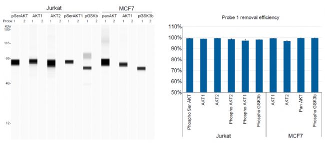 RePlex中的關(guān)鍵步驟是在第一輪探測(cè)后能有效去除抗體。因此,評(píng)估了針對(duì)Jurkat和MCF7裂解物的pan AKT/AKT1/AKT2/p-AKT1/p-AKT2/p-GSK3b抗體的去除效率。結(jié)果顯示,所有測(cè)試的抗體均顯示出超過(guò)96%的去除效率,而大多數(shù)測(cè)試的抗體均顯示出98%或更高的去除率。這些數(shù)據(jù)表明進(jìn)行第二輪抗體探測(cè)時(shí),與第一輪探測(cè)幾乎沒(méi)有交叉。