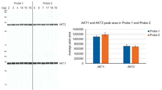為了證明探針1和探針2之間的信號(hào)強(qiáng)度和可重復(fù)性沒(méi)有受到影響,在兩個(gè)檢測(cè)步驟中測(cè)量了MCF7裂解物中AKT1和AKT2抗體的信號(hào)強(qiáng)度。結(jié)果顯示,不管檢測(cè)每種蛋白質(zhì)的順序如何,在RePlex分析中在探針1或探針2中檢測(cè)到的MCF7裂解物中的AKT1和AKT2在兩個(gè)檢測(cè)周期中均具有出色的重現(xiàn)性和相似的信號(hào)強(qiáng)度。