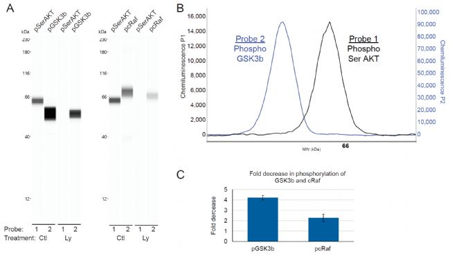 RePlex檢測(cè)技術(shù)可以檢測(cè)同一樣品中多種蛋白質(zhì)磷酸化的狀態(tài)變化,并對(duì)其進(jìn)行定量分析(使用對(duì)照和經(jīng)LY294002處理的Jurkat細(xì)胞的裂解物的p-AKT/p-GSK3b/p-cRaf的定量分析)。