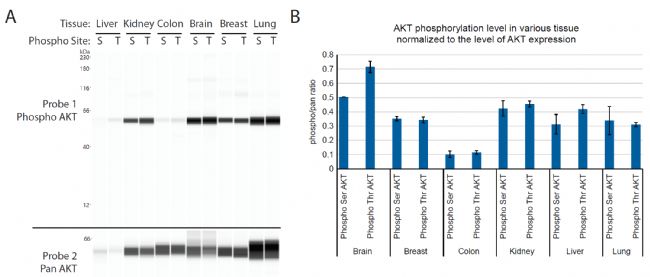 利用RePlex技術(shù)表征了多種組織類型中AKT的磷酸化狀態(tài)。同一毛細(xì)管中檢測(cè)多種組織類型,包括肝,腎,結(jié)腸,腦,乳腺和肺中的panAKT和p-AKT。同時(shí)分析了不同組織中歸一化panAKT后,p-AKT信號(hào)的變化,即不同組織顯示出不同水平的AKT表達(dá)和磷酸化。