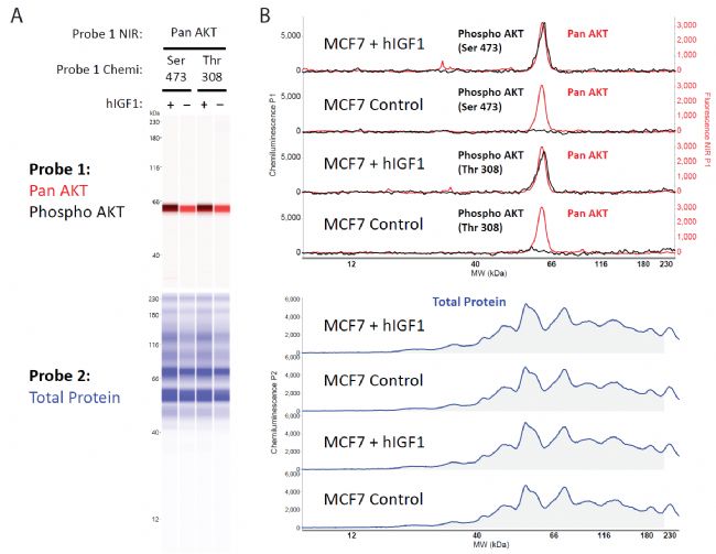 利用RePlex技術(shù)可以在第一輪免疫雜交中進(jìn)行不同靶蛋白的測(cè)定,并在同一毛細(xì)管中進(jìn)行第二輪總蛋白檢測(cè)。利用未經(jīng)處理和用人IGF1(hIGF1)處理過(guò)的MCF7細(xì)胞,第一輪檢測(cè)Pan AKT(NIR通道)和p-AKT(化學(xué)發(fā)光通道),第二輪檢測(cè)同一根毛細(xì)管中的總蛋白。結(jié)果顯示,利用Jess不同通道以及RePlex技術(shù)可以達(dá)到一份樣品獲取多個(gè)靶點(diǎn)的定量數(shù)據(jù)。