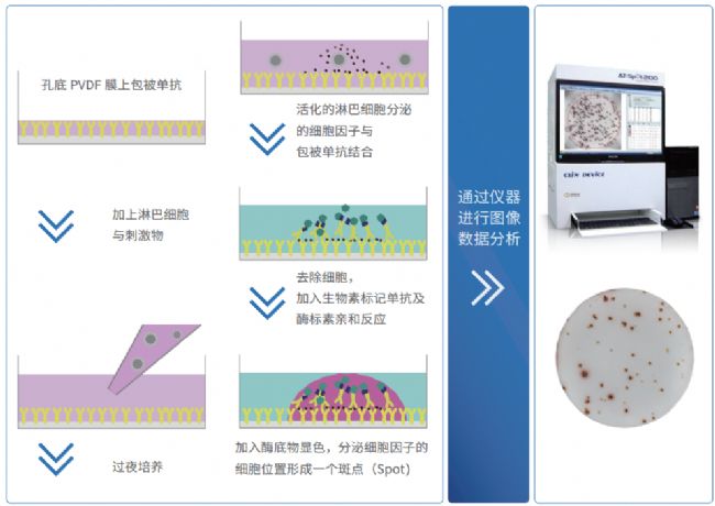 ELISPOT的實驗原理和流程如圖2所示,通過捕獲抗體和檢測抗體,和待測細胞因子形成“三明治夾心”,加入酶底物顯色,分泌細胞因子的細胞位置形成“斑點”,用儀器對形成的“斑點”進行成像和計數(shù)分析。所用儀器就是“酶聯(lián)免疫斑點圖像分析儀”。