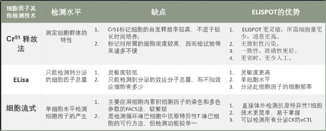 各種細胞因子檢測技術對比如圖3所示。由于ELISPOT法具有較高的特異性和敏感性,易操作,成本相對流式細胞分析術也較低,已被廣泛用于分泌CK細胞檢測或ASC測定中,對探索自身免疫系統(tǒng)疾病發(fā)病機制具有重要意義。