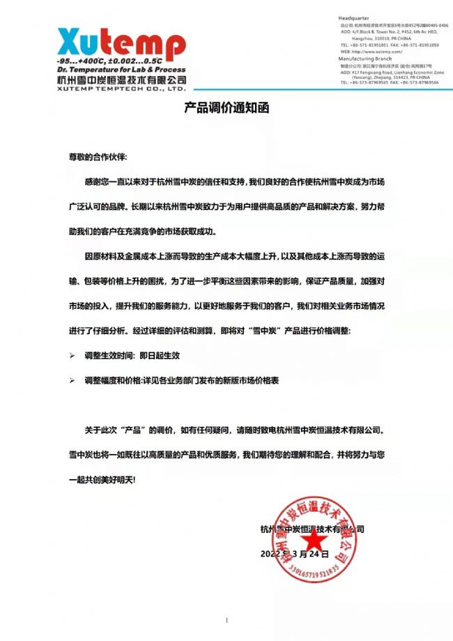 2022年杭州雪中炭恒溫技術(shù)有限公司產(chǎn)品調(diào)價(jià)通知