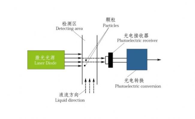 當液體中的微粒通過一窄細檢測通道時,與液體流向垂直的入射光,由于被微粒阻擋而減弱,因此由傳感器輸出的信號降低,這種信號變化與微粒的截面積大小相關。