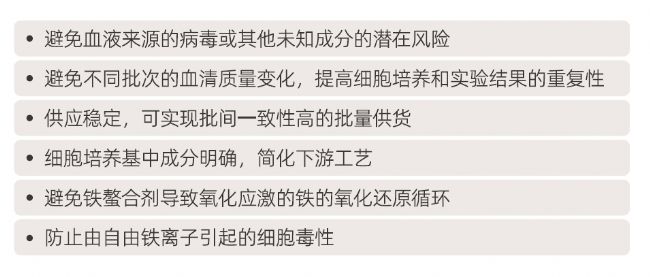 傳統(tǒng)的細(xì)胞培養(yǎng)基由基礎(chǔ)培養(yǎng)基添加胎;蛐∨Q褰M成。血清是一種含有細(xì)胞生長(zhǎng)所需生長(zhǎng)因子的補(bǔ)充劑。而血清制品的定義不明確的性質(zhì)對(duì)于下游研究和治療應(yīng)用是不可取的,并且存在批次間差異。同時(shí),血清可能含有細(xì)胞生長(zhǎng)抑制因子和毒性因子,存在潛在毒性,血清的獲取成本高。血清由于成分不完全明確,給細(xì)胞培養(yǎng)的標(biāo)準(zhǔn)化帶來(lái)困難,同時(shí)也給細(xì)胞表達(dá)目的產(chǎn)物純化等下游操作帶來(lái)困難。為了克服與血清相關(guān)的不一致性能,無(wú)血清培養(yǎng)基是絕對(duì)必要的。