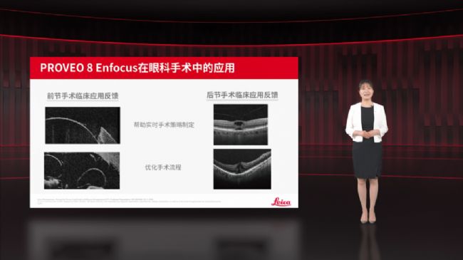 徠卡顯微系統(tǒng)醫(yī)療部應(yīng)用主管蔡宇女士為我們詳細(xì)介紹了Proveo 8 Enfocus 一體化術(shù)中OCT在眼科手術(shù)中的應(yīng)用。