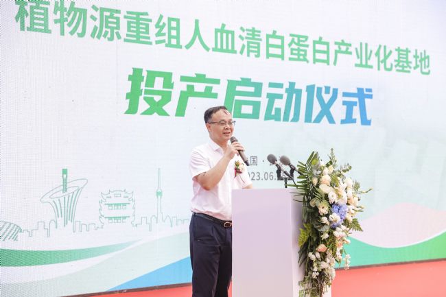 禾元生物董事長楊代常教授對出席投產(chǎn)儀式的各位領(lǐng)導(dǎo)、嘉賓表示熱烈歡迎和衷心地感謝,分享了禾元生物智能化工廠建設(shè)的艱辛歷程和取得的成績。智能化工廠規(guī)劃年產(chǎn)10噸的植物源重組人血清白蛋白原液及100萬支制劑產(chǎn)品,投產(chǎn)后可實現(xiàn)重組人血清白蛋白藥品的規(guī);a(chǎn),填補巨大的市場缺口,安全有效地解決我國人血清白蛋白藥品供應(yīng)問題。這標(biāo)志著禾元生物在植物分子醫(yī)藥技術(shù)和創(chuàng)新生物醫(yī)藥產(chǎn)業(yè)化進程上邁向國際新高度,是我國“制造大國”向“制造強國”邁進的行業(yè)典范。