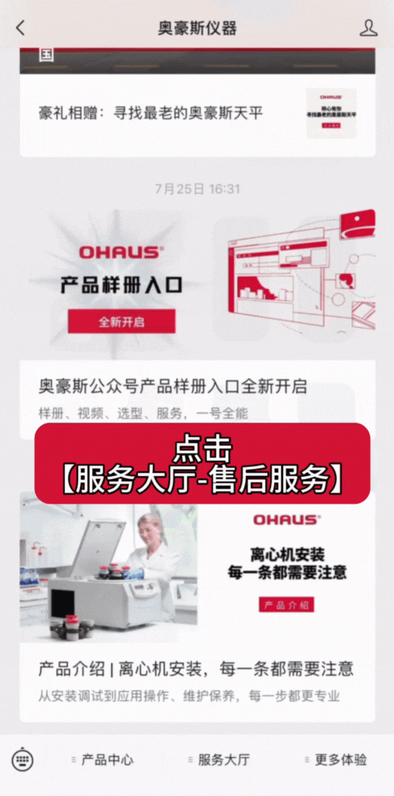 第 一步:進入奧豪斯公眾號,點擊下方菜單欄的【服務大廳 - 售后服務】登錄或注冊賬號