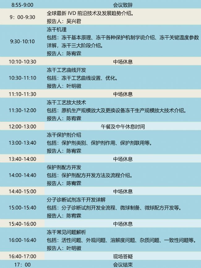 研討會主要內(nèi)容:發(fā)布凍干最新應(yīng)用開發(fā)技術(shù)。涵蓋各領(lǐng)域凍干技術(shù)開發(fā)難點(diǎn)及對應(yīng)解決措施。